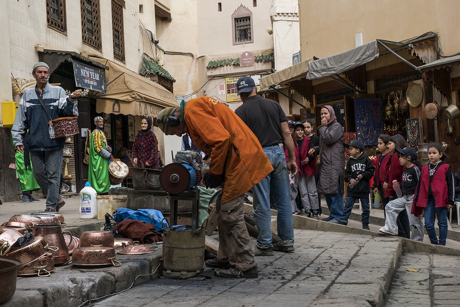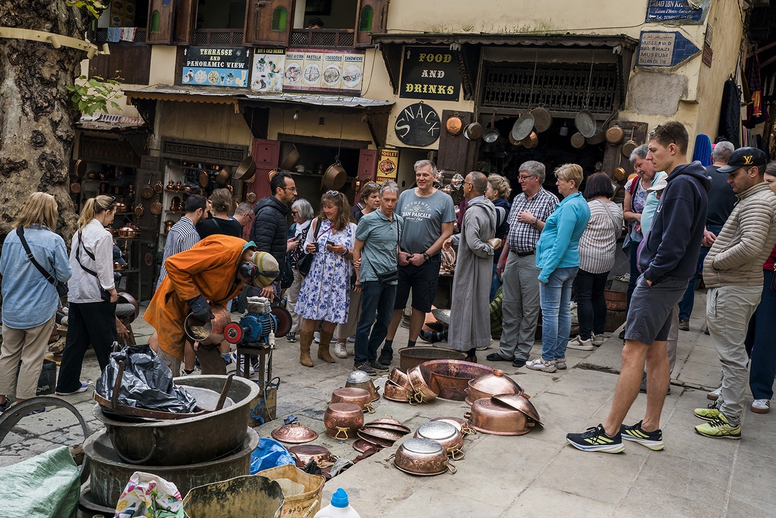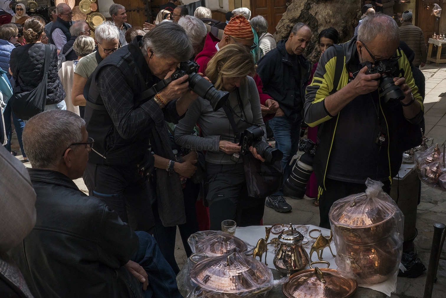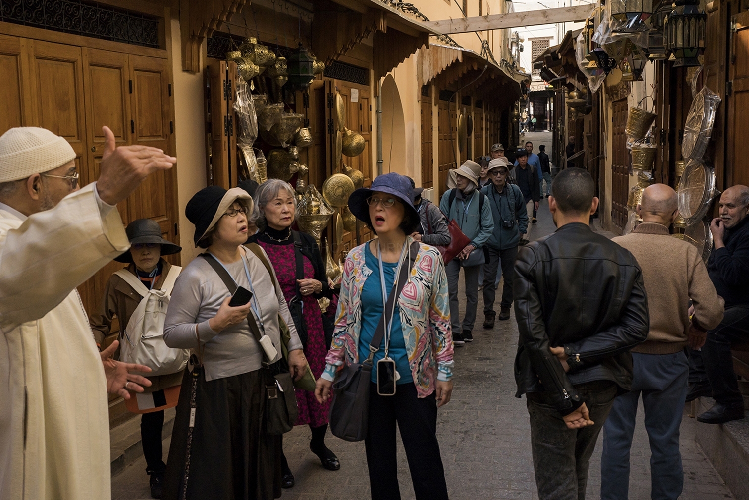 Como el zoco o las llamadas al rezo desde los minaretes, el turismo masivo forma parte tal indisoluble de la vieja Medina como el aire que se respira. En pleno Ramadán, el día transcurre con su vibrante rutina: mercados abarrotados, el incesante martilleo de los caldereros y el persistente aroma de las curtidurías. Las compactas oleadas que entran y salen de las mezquitas se entremezclan con el ir y venir de cúmulos de turismo multinacional pendientes ante todo de la banderita del guía. En medio de la soleada Plaza Safarine un nutrido grupo de aspecto centroeuropeo se detiene en torno a un calderero que templa una pieza descomunal sobre un hornillo. El guía, un joven marroquí en flamante chilaba color añil, da indicaciones en alemán: «son ustedes libres de fotografiar a su antojo». Ni el enjambre de cámaras que le encuadran saca al artesano de su labor. Ni una mirada, ni un triste «salam aleikun» que indique contacto. Pero el término ‘decorado viviente’ que sugiere la escena y que hace a Fez tan atractiva para la industria turística podría aplicarse también a la manera en que los residentes perciben esta incesante avalancha: una masiva fuente de ingresos, controlada para que moleste lo justo. De hecho, fuera de las horas laborables de los guías, y especial tras la puesta de sol, la Medina recupera su genuina atmósfera musulmana. Con la inmensa mayoría de los extranjeros refugiados en alguno de los miles de airb’nb y similares que minan de arriba abajo la ciudadela, el colorido ambiente callejero vibra a la luz rojiza de las farolas, aparentemente ajeno a signo alguno de gentrificación.