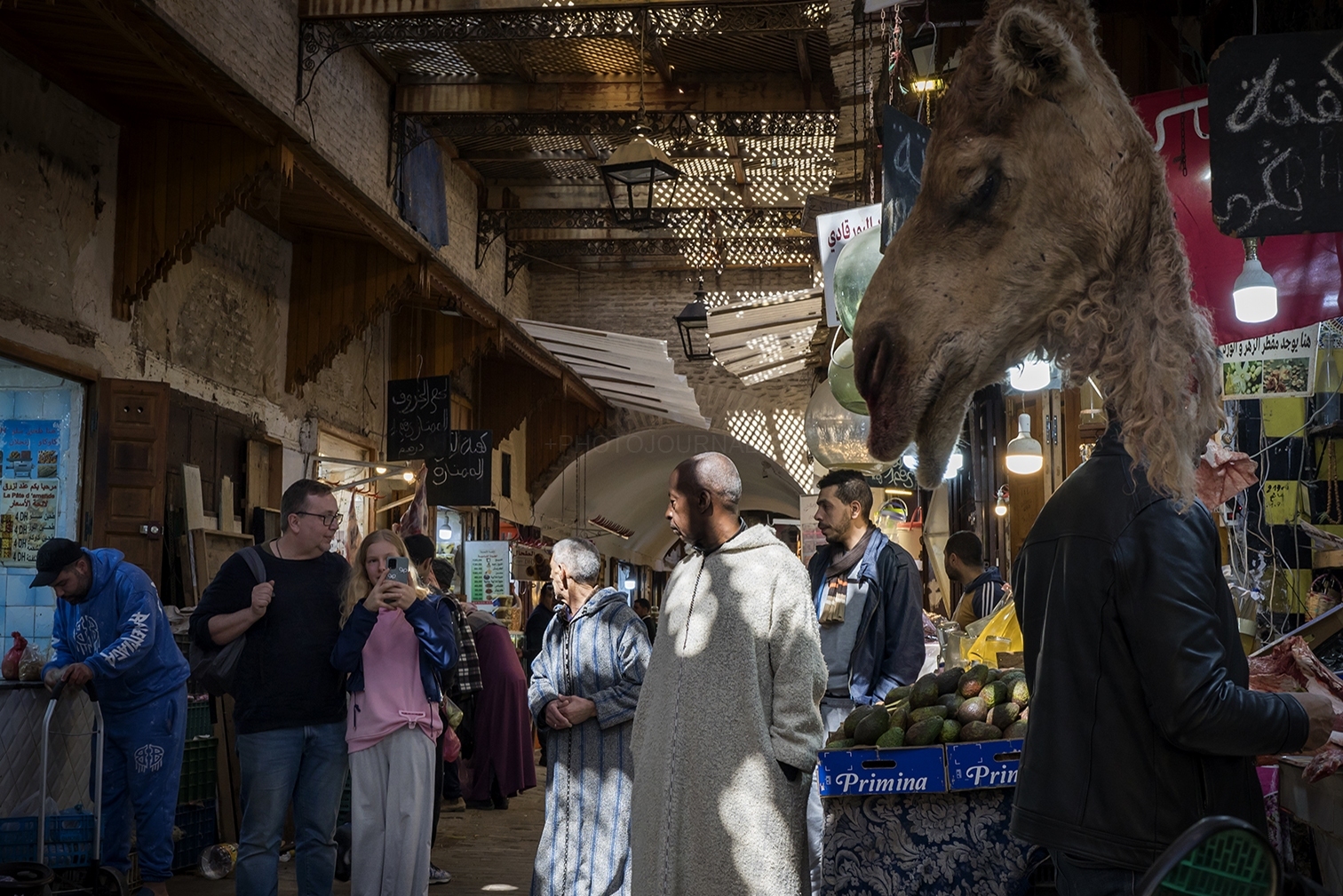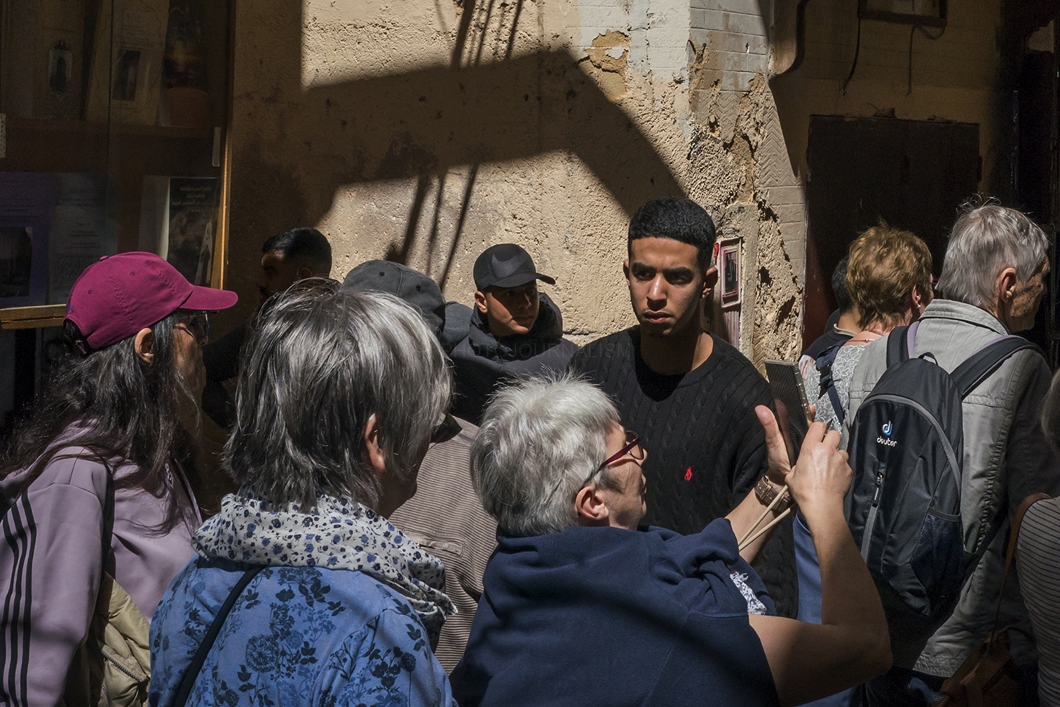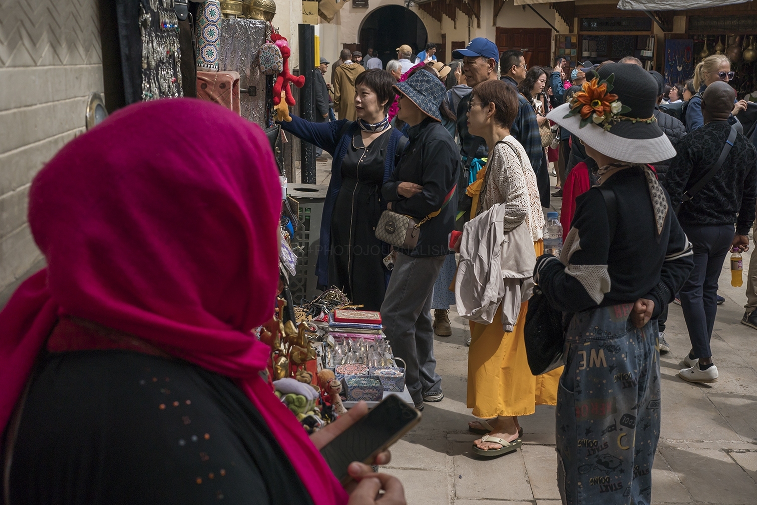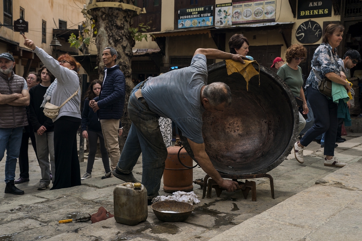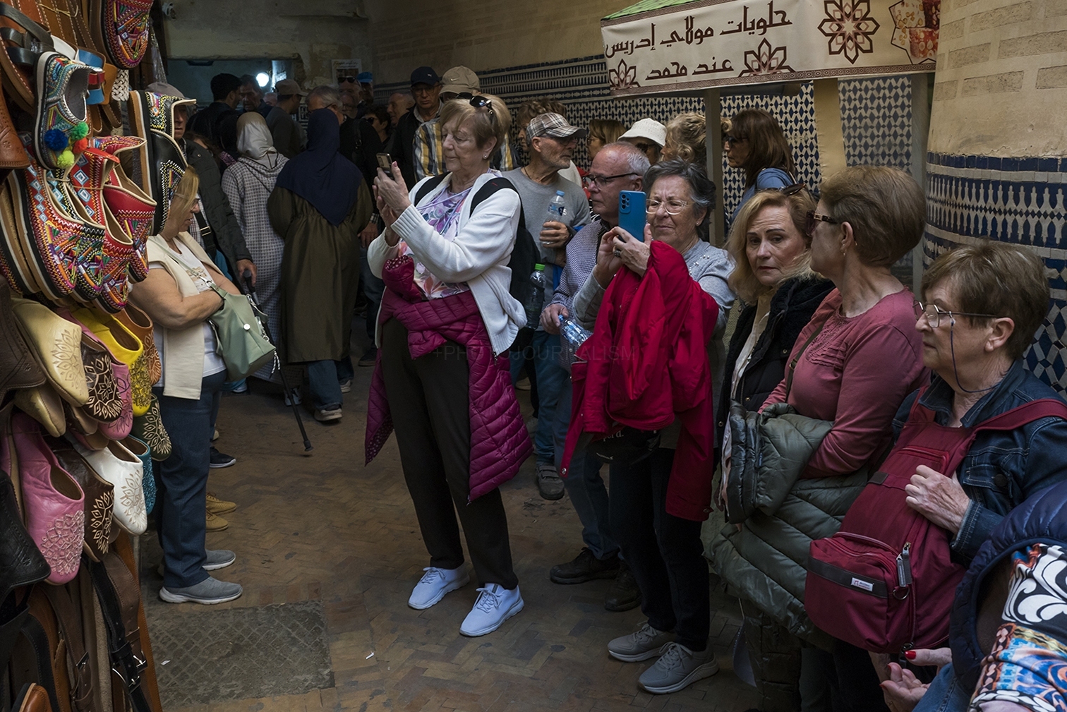 Como el zoco o las llamadas al rezo desde los minaretes, el turismo masivo forma parte tal indisoluble de la vieja Medina como el aire que se respira. En pleno Ramadán, el día transcurre con su vibrante rutina: mercados abarrotados, el incesante martilleo de los caldereros y el persistente aroma de las curtidurías. Las compactas oleadas que entran y salen de las mezquitas se entremezclan con el ir y venir de cúmulos de turismo multinacional pendientes ante todo de la banderita del guía. En medio de la soleada Plaza Safarine un nutrido grupo de aspecto centroeuropeo se detiene en torno a un calderero que templa una pieza descomunal sobre un hornillo. El guía, un joven marroquí en flamante chilaba color añil, da indicaciones en alemán: «son ustedes libres de fotografiar a su antojo». Ni el enjambre de cámaras que le encuadran saca al artesano de su labor. Ni una mirada, ni un triste «salam aleikun» que indique contacto. Pero el término ‘decorado viviente’ que sugiere la escena y que hace a Fez tan atractiva para la industria turística podría aplicarse también a la manera en que los residentes perciben esta incesante avalancha: una masiva fuente de ingresos, controlada para que moleste lo justo. De hecho, fuera de las horas laborables de los guías, y especial tras la puesta de sol, la Medina recupera su genuina atmósfera musulmana. Con la inmensa mayoría de los extranjeros refugiados en alguno de los miles de airb’nb y similares que minan de arriba abajo la ciudadela, el colorido ambiente callejero vibra a la luz rojiza de las farolas, aparentemente ajeno a signo alguno de gentrificación.