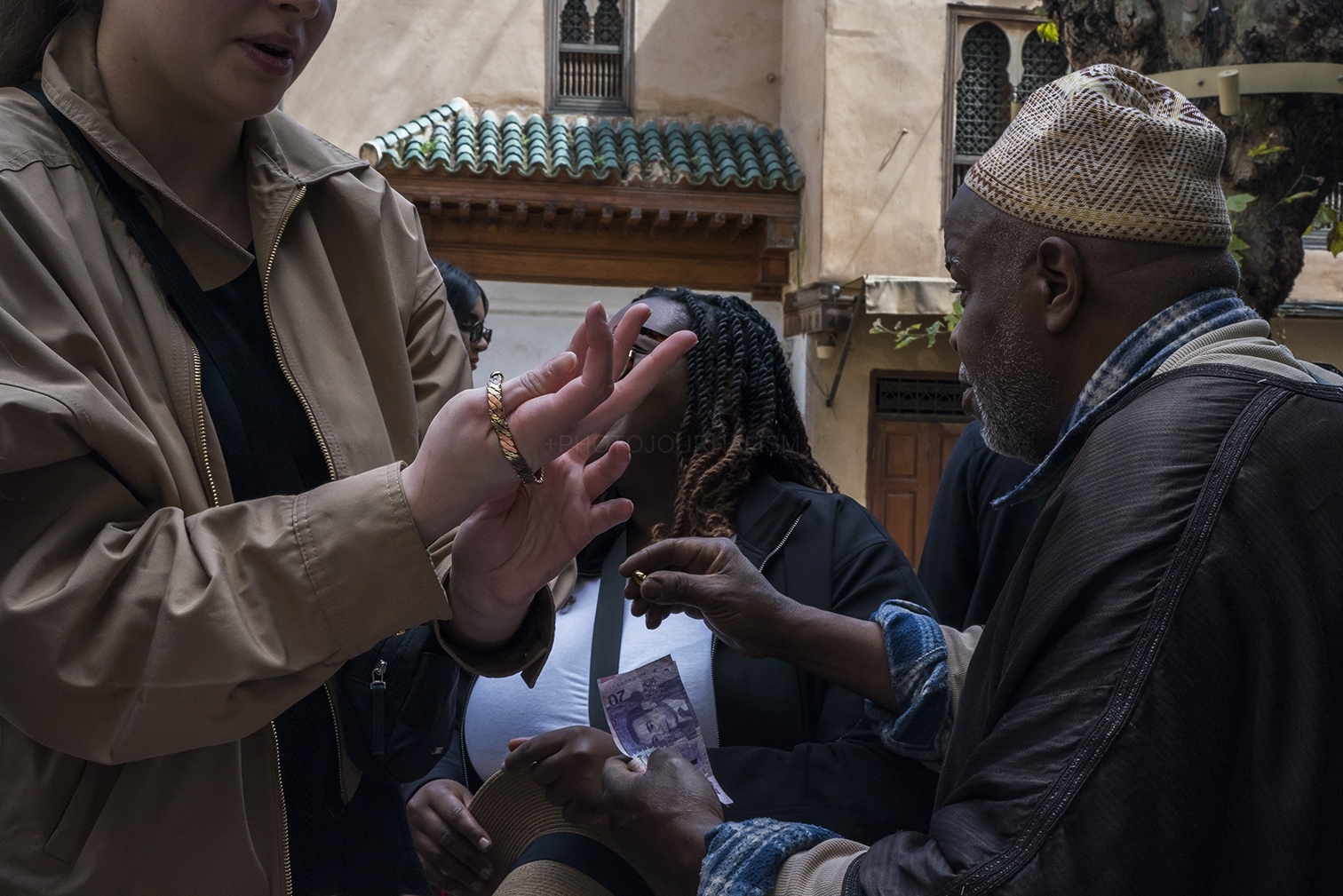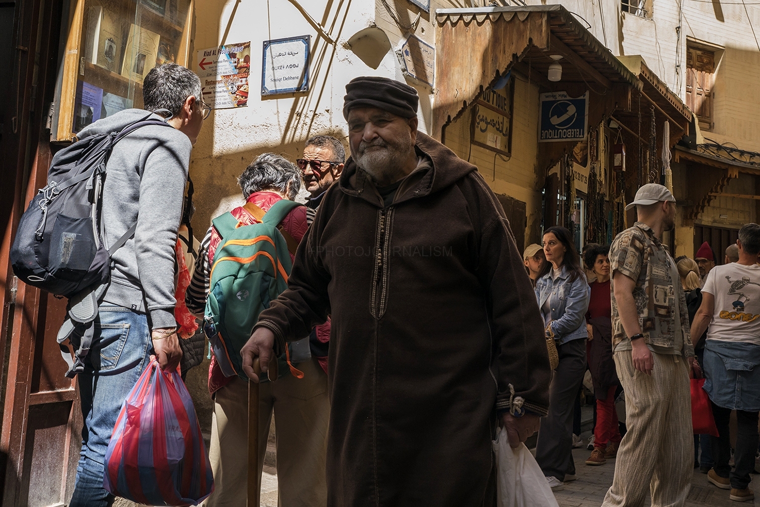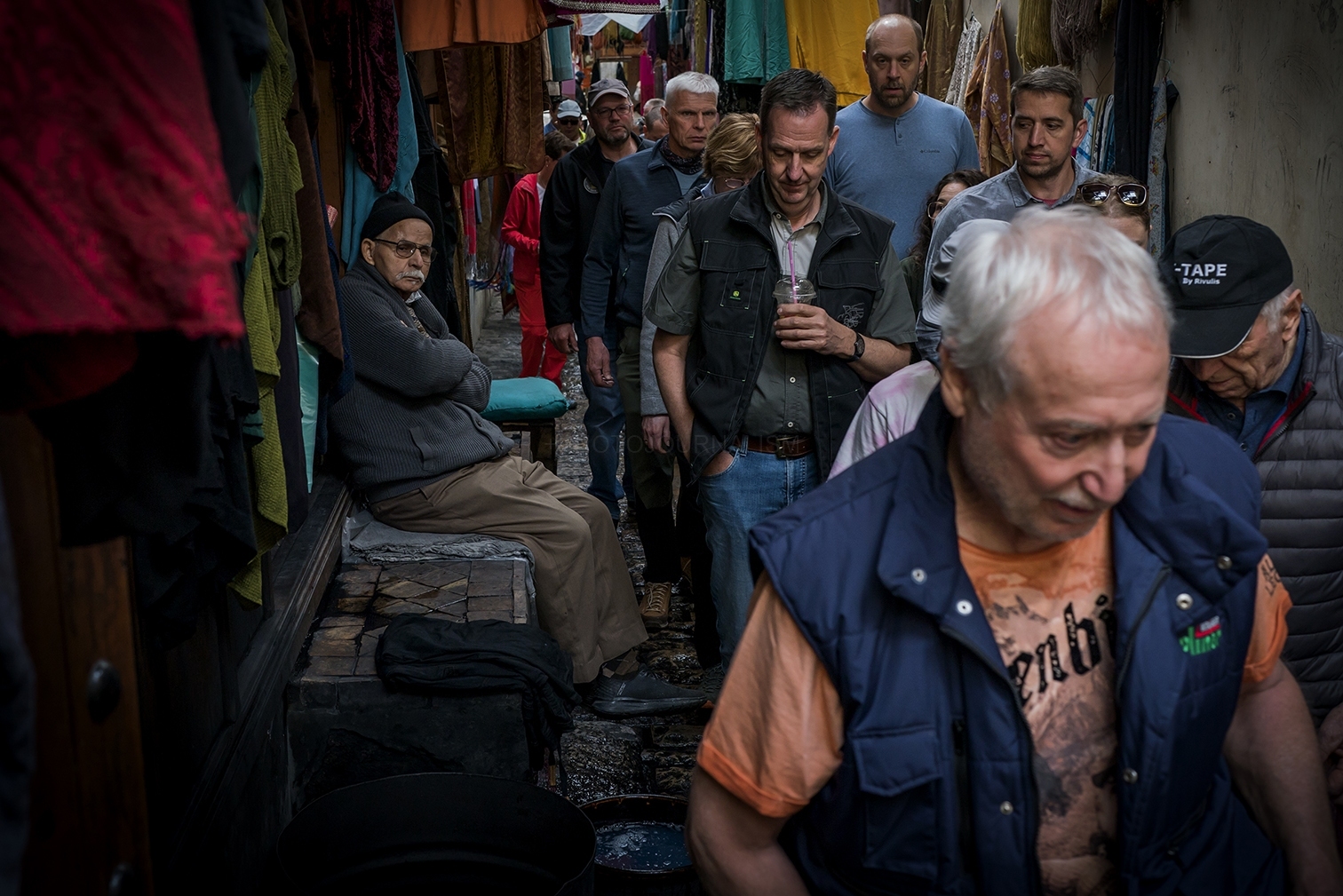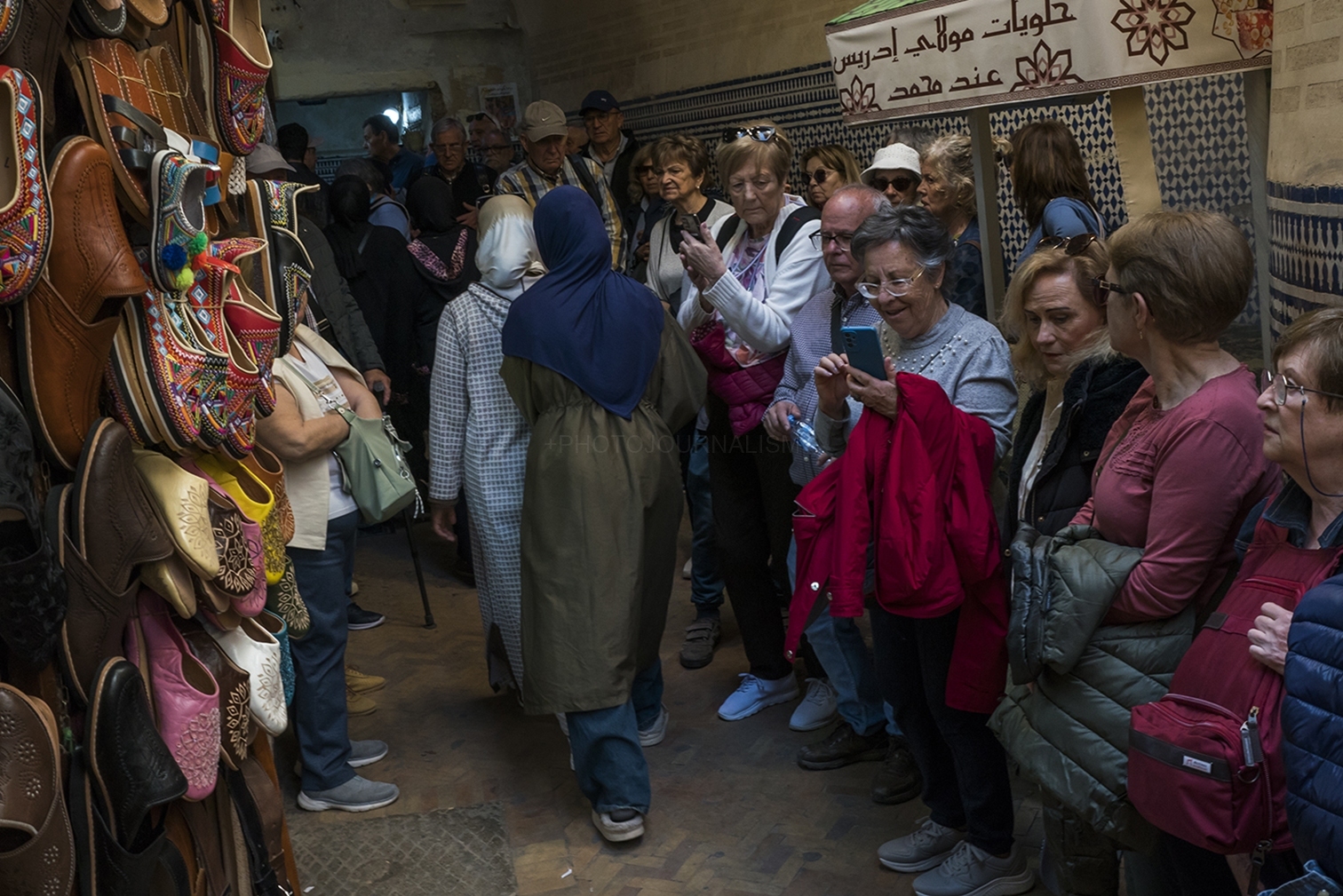 Como el zoco o las llamadas al rezo desde los minaretes, el turismo masivo forma parte tal indisoluble de la vieja Medina como el aire que se respira. En pleno Ramadán, el día transcurre con su vibrante rutina: mercados abarrotados, el incesante martilleo de los caldereros y el persistente aroma de las curtidurías. Las compactas oleadas que entran y salen de las mezquitas se entremezclan con el ir y venir de cúmulos de turismo multinacional pendientes ante todo de la banderita del guía. En medio de la soleada Plaza Safarine un nutrido grupo de aspecto centroeuropeo se detiene en torno a un calderero que templa una pieza descomunal sobre un hornillo. El guía, un joven marroquí en flamante chilaba color añil, da indicaciones en alemán: «son ustedes libres de fotografiar a su antojo». Ni el enjambre de cámaras que le encuadran saca al artesano de su labor. Ni una mirada, ni un triste «salam aleikun» que indique contacto. Pero el término ‘decorado viviente’ que sugiere la escena y que hace a Fez tan atractiva para la industria turística podría aplicarse también a la manera en que los residentes perciben esta incesante avalancha: una masiva fuente de ingresos, controlada para que moleste lo justo. De hecho, fuera de las horas laborables de los guías, y especial tras la puesta de sol, la Medina recupera su genuina atmósfera musulmana. Con la inmensa mayoría de los extranjeros refugiados en alguno de los miles de airb’nb y similares que minan de arriba abajo la ciudadela, el colorido ambiente callejero vibra a la luz rojiza de las farolas, aparentemente ajeno a signo alguno de gentrificación.