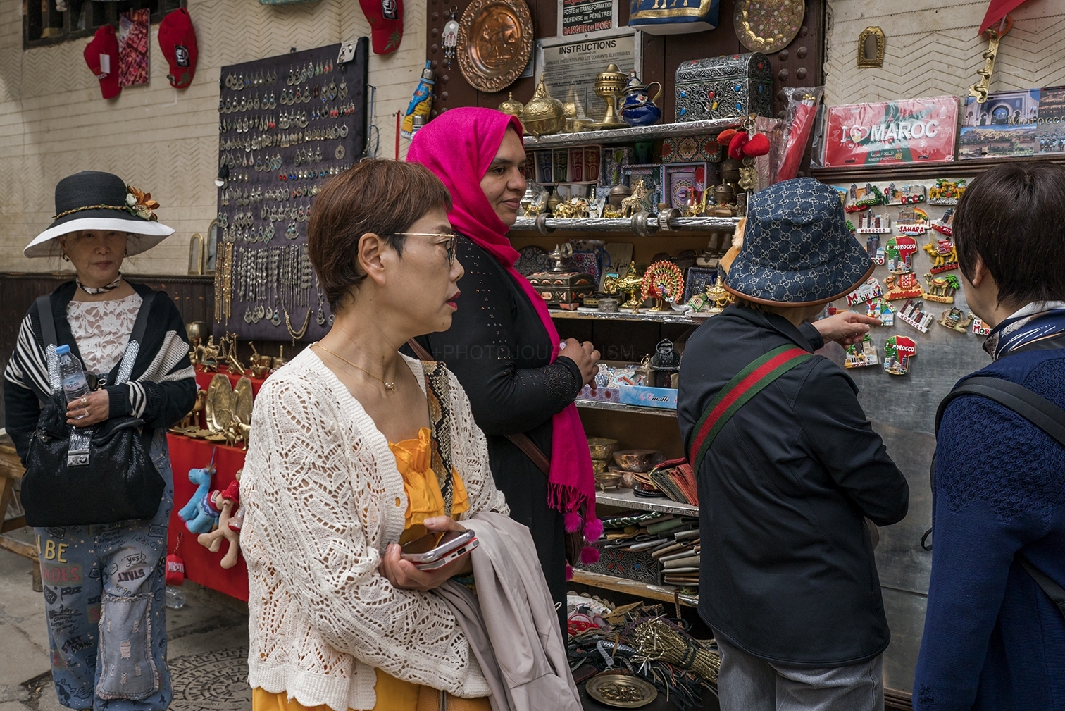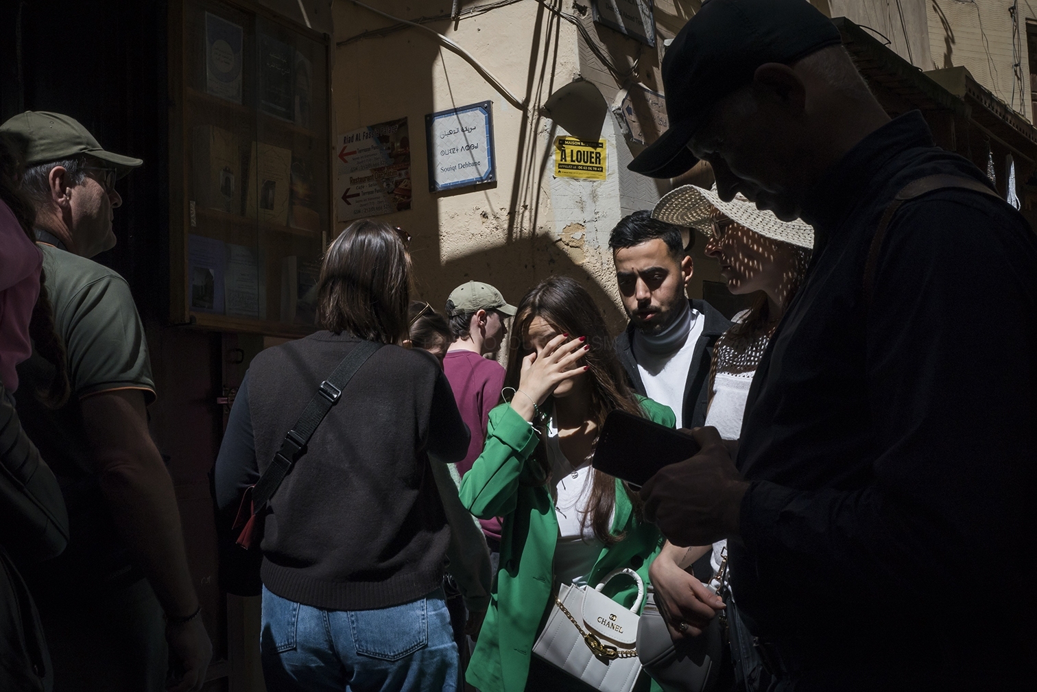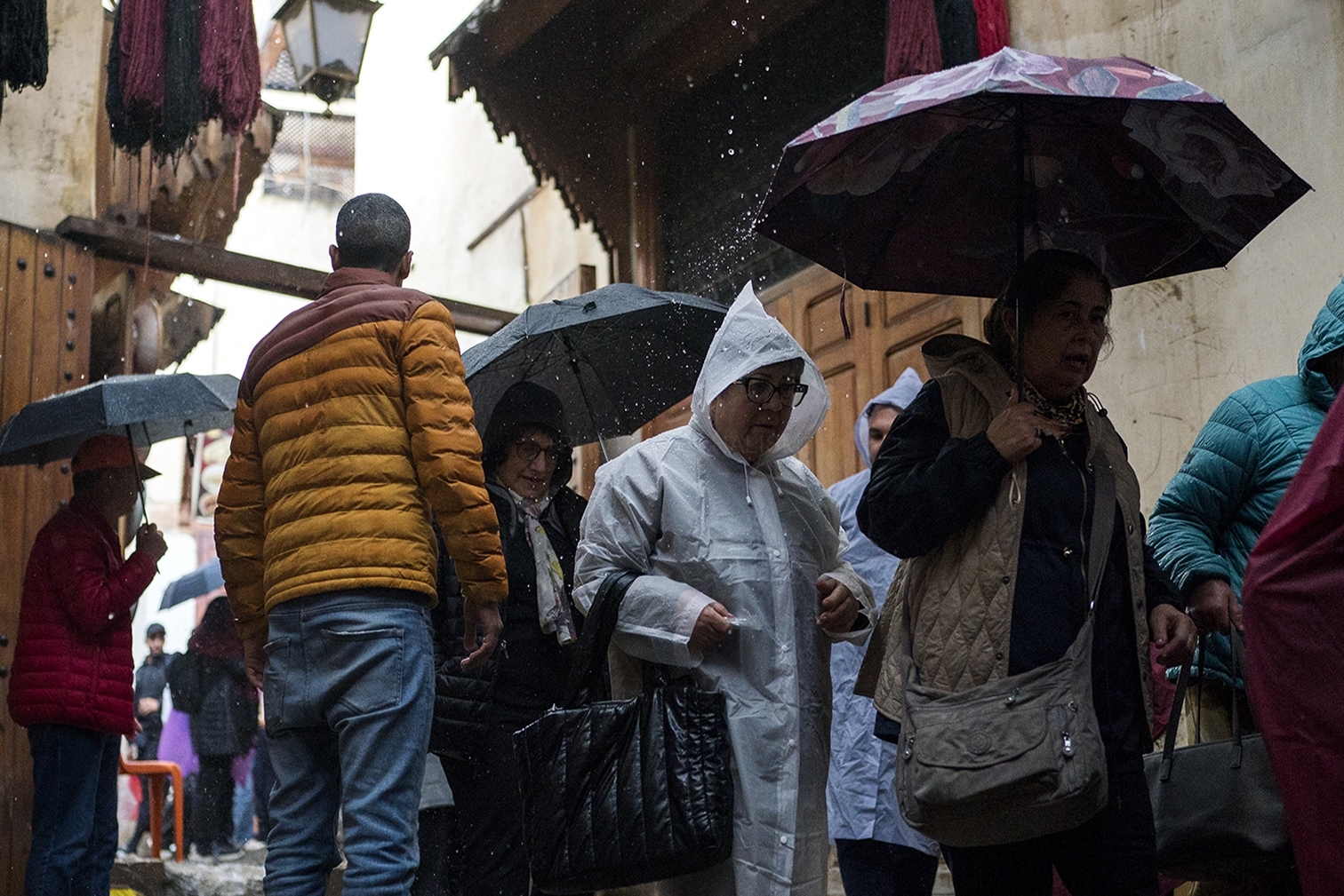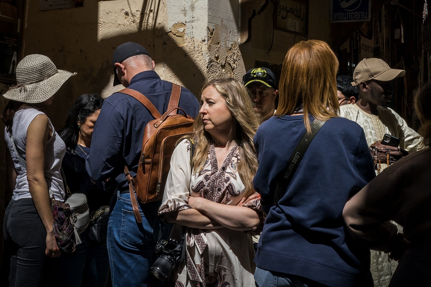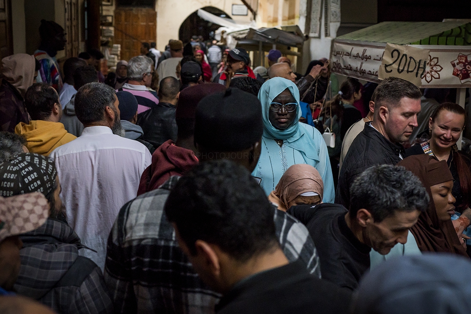 Como el zoco o las llamadas al rezo desde los minaretes, el turismo masivo forma parte tal indisoluble de la vieja Medina como el aire que se respira. En pleno Ramadán, el día transcurre con su vibrante rutina: mercados abarrotados, el incesante martilleo de los caldereros y el persistente aroma de las curtidurías. Las compactas oleadas que entran y salen de las mezquitas se entremezclan con el ir y venir de cúmulos de turismo multinacional pendientes ante todo de la banderita del guía. En medio de la soleada Plaza Safarine un nutrido grupo de aspecto centroeuropeo se detiene en torno a un calderero que templa una pieza descomunal sobre un hornillo. El guía, un joven marroquí en flamante chilaba color añil, da indicaciones en alemán: «son ustedes libres de fotografiar a su antojo». Ni el enjambre de cámaras que le encuadran saca al artesano de su labor. Ni una mirada, ni un triste «salam aleikun» que indique contacto. Pero el término ‘decorado viviente’ que sugiere la escena y que hace a Fez tan atractiva para la industria turística podría aplicarse también a la manera en que los residentes perciben esta incesante avalancha: una masiva fuente de ingresos, controlada para que moleste lo justo. De hecho, fuera de las horas laborables de los guías, y especial tras la puesta de sol, la Medina recupera su genuina atmósfera musulmana. Con la inmensa mayoría de los extranjeros refugiados en alguno de los miles de airb’nb y similares que minan de arriba abajo la ciudadela, el colorido ambiente callejero vibra a la luz rojiza de las farolas, aparentemente ajeno a signo alguno de gentrificación.