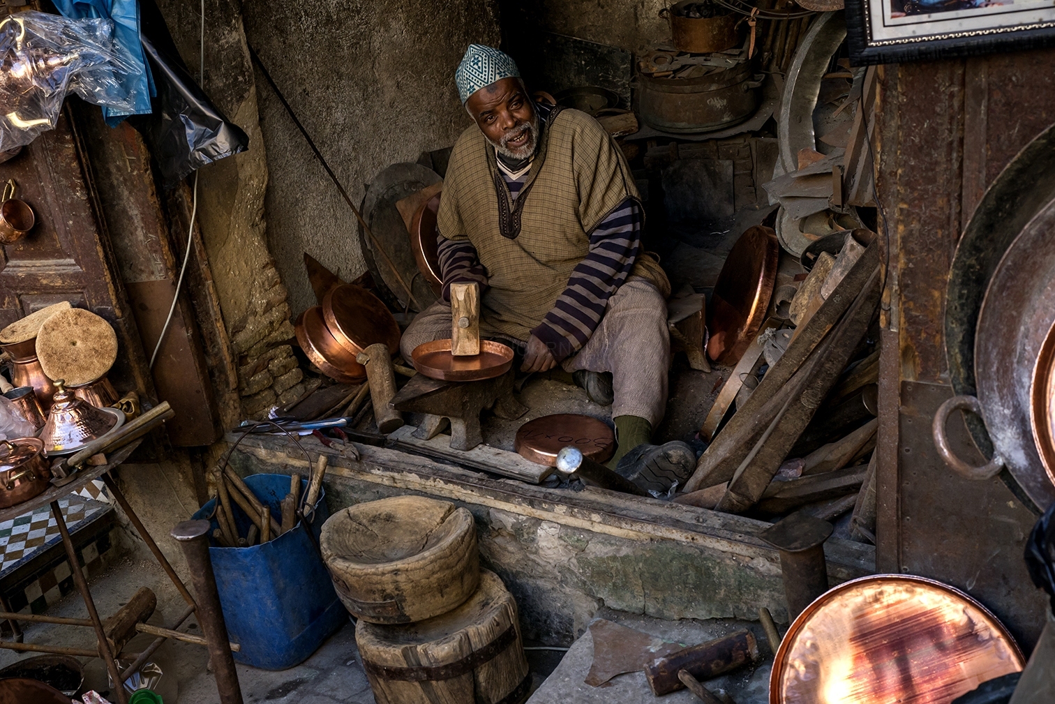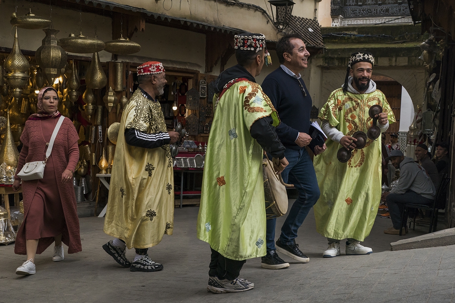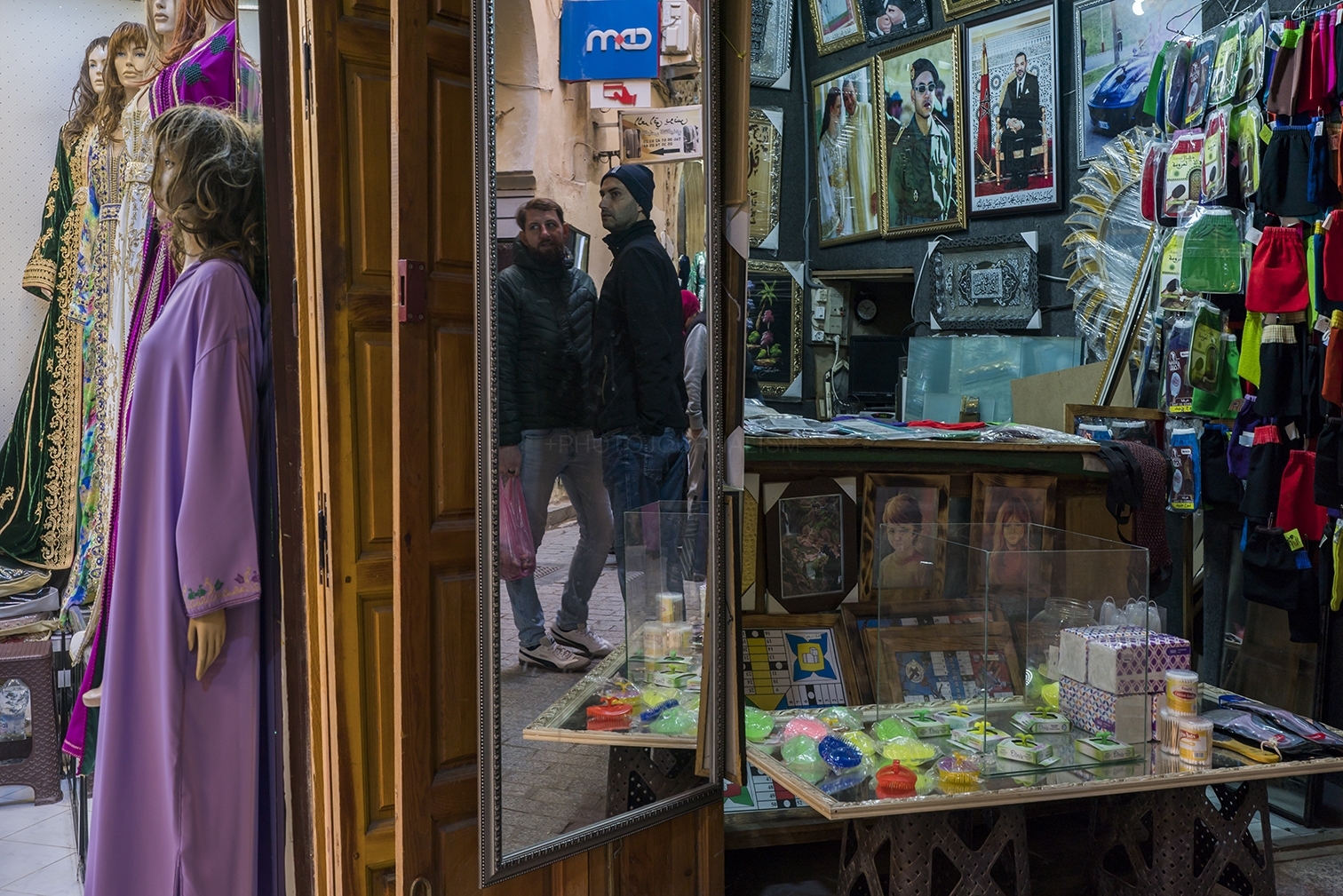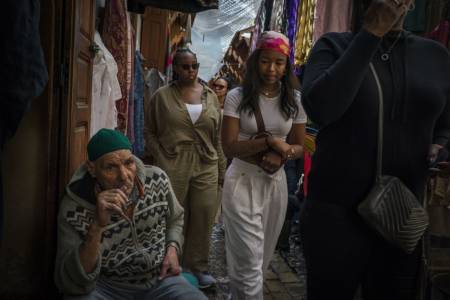 Como el zoco o las llamadas al rezo desde los minaretes, el turismo masivo forma parte tal indisoluble de la vieja Medina como el aire que se respira. En pleno Ramadán, el día transcurre con su vibrante rutina: mercados abarrotados, el incesante martilleo de los caldereros y el persistente aroma de las curtidurías. Las compactas oleadas que entran y salen de las mezquitas se entremezclan con el ir y venir de cúmulos de turismo multinacional pendientes ante todo de la banderita del guía. En medio de la soleada Plaza Safarine un nutrido grupo de aspecto centroeuropeo se detiene en torno a un calderero que templa una pieza descomunal sobre un hornillo. El guía, un joven marroquí en flamante chilaba color añil, da indicaciones en alemán: «son ustedes libres de fotografiar a su antojo». Ni el enjambre de cámaras que le encuadran saca al artesano de su labor. Ni una mirada, ni un triste «salam aleikun» que indique contacto. Pero el término ‘decorado viviente’ que sugiere la escena y que hace a Fez tan atractiva para la industria turística podría aplicarse también a la manera en que los residentes perciben esta incesante avalancha: una masiva fuente de ingresos, controlada para que moleste lo justo. De hecho, fuera de las horas laborables de los guías, y especial tras la puesta de sol, la Medina recupera su genuina atmósfera musulmana. Con la inmensa mayoría de los extranjeros refugiados en alguno de los miles de airb’nb y similares que minan de arriba abajo la ciudadela, el colorido ambiente callejero vibra a la luz rojiza de las farolas, aparentemente ajeno a signo alguno de gentrificación.